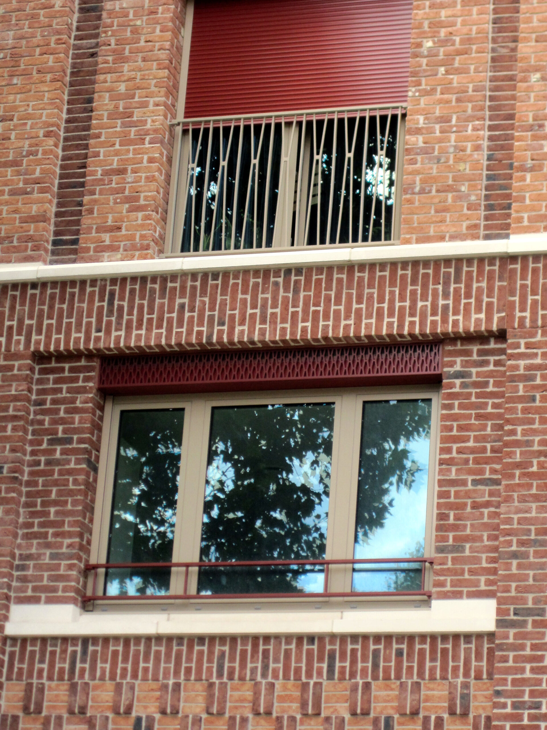 The use of materials is interesting, and although there is some fakery to the brickwork (common these days), the patterns are original, and the floor to ceiling windows and detailing lift the facades above the ordinary allowing it to not shout ‘social housing’. Care has been used in the design, and as the RIBA journal notes, it has tenant-friendly touches such as heat-regulating shutters. The shutters are said to have been designed to reduce overheating, eliminating the need for air conditioning and opening windows onto a potentially noisy Wood Lane, and the Hammersmith & City railway line immediately adjacent. There’s some interesting detailing internally too. There are a few more photos on our Instagram