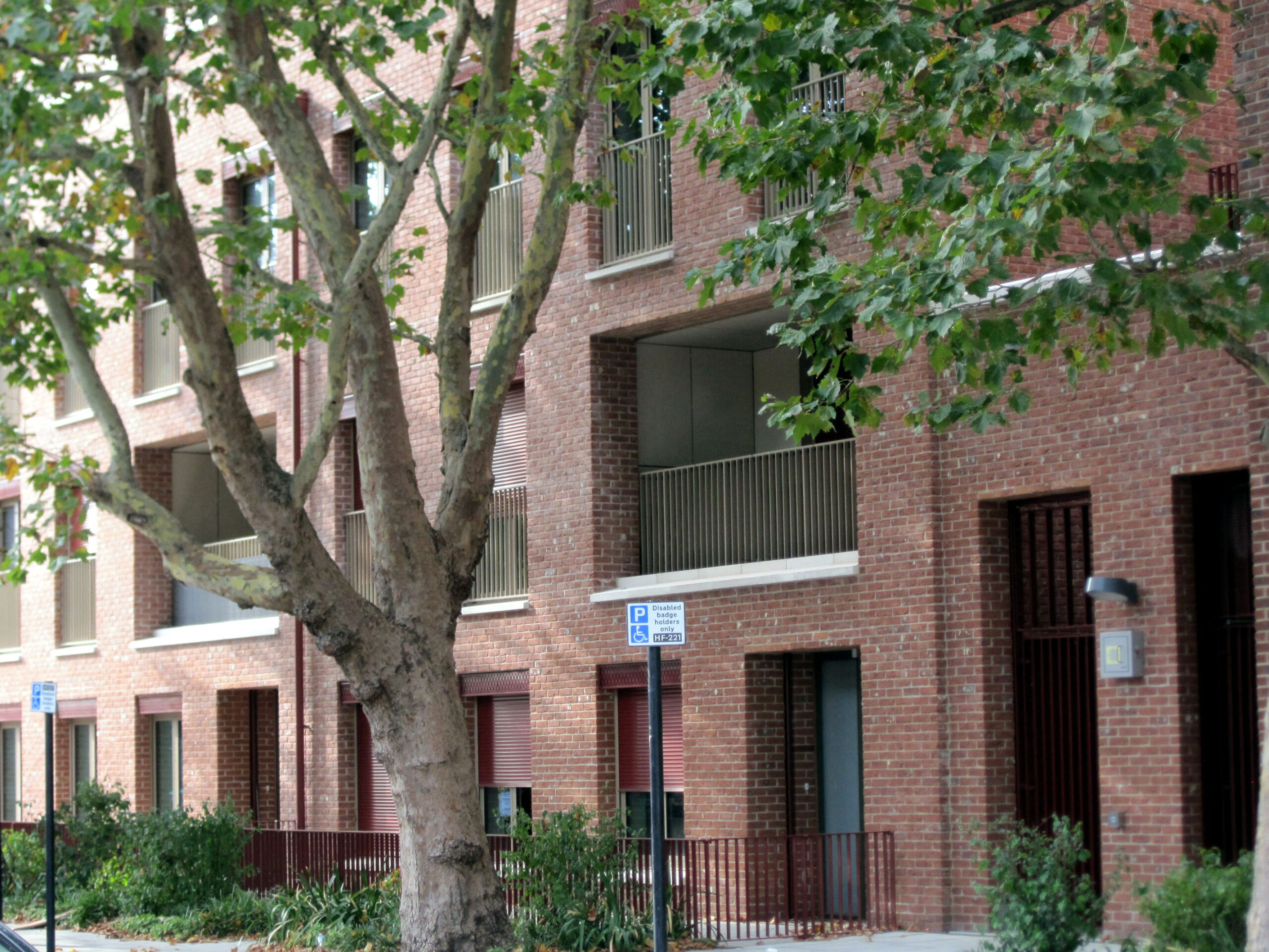 Finely detailed brickwork is the feature in this new development on the corner of Macfarlane Road and Wood Lane opposite Westfield, designed by Maccreanor Lavington for Peabody Housing Association. It replaces the former BBC car park with a pair of appropriately-sized mid-rise buildings, providing 142 affordable homes in a mixture of shared ownership, London Affordable Rent and London Living Rent with 68 x 1 bed, 67 x 2 bed and 7 x 3-bed flats.