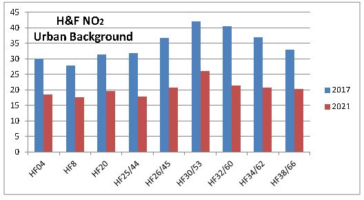 The rest of its 56 sampling points are ‘diffusion tubes’, taken to a lab to be analysed monthly. We’re most interested in people’s typical long term exposures at home, where stats show we spend 80% of the time, rather than sniffing roadside emissions, so we selected out the 9 “urban background” readings and plotted them adjacent. An average 41% reduction in NO2 2017-2021, to mostly less than half the WHO 2005 recommendation of 40ug/m3.