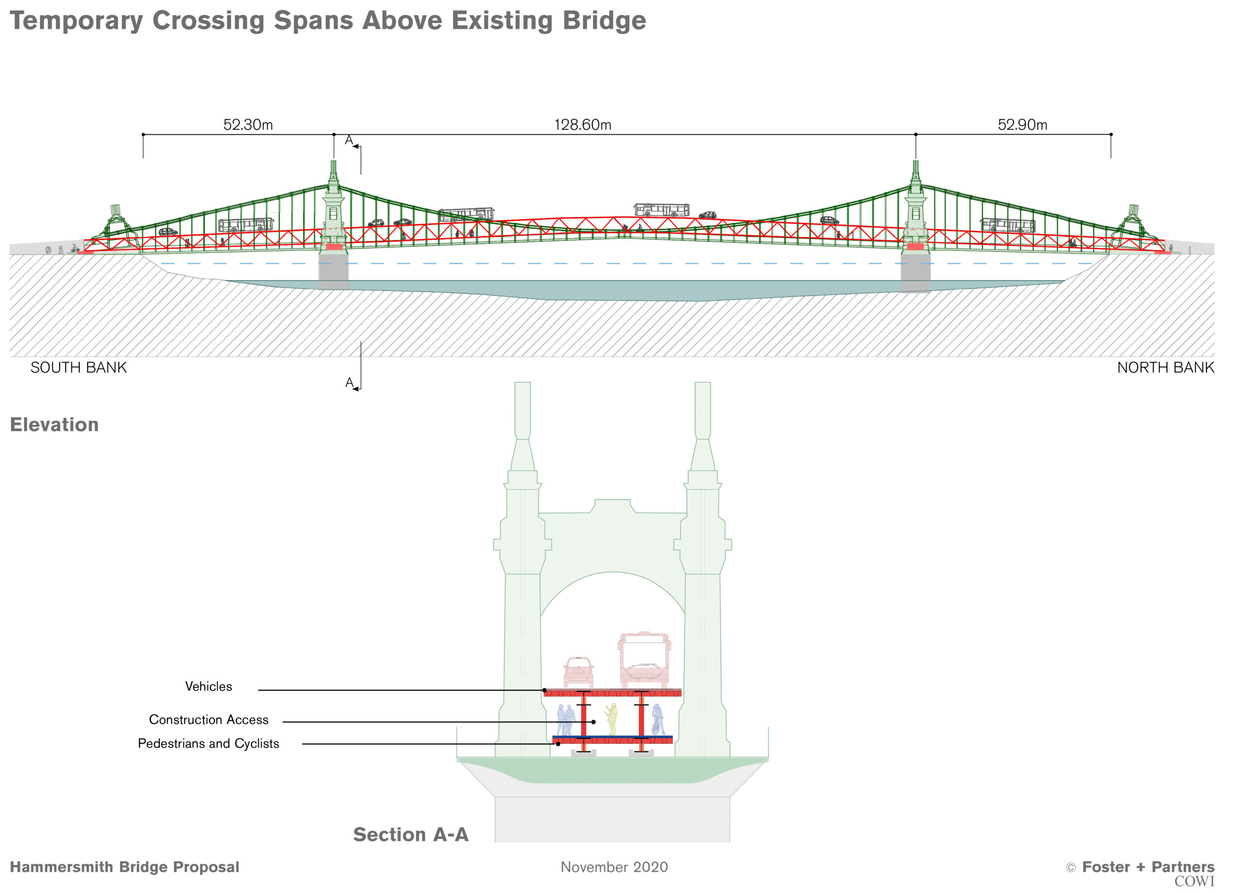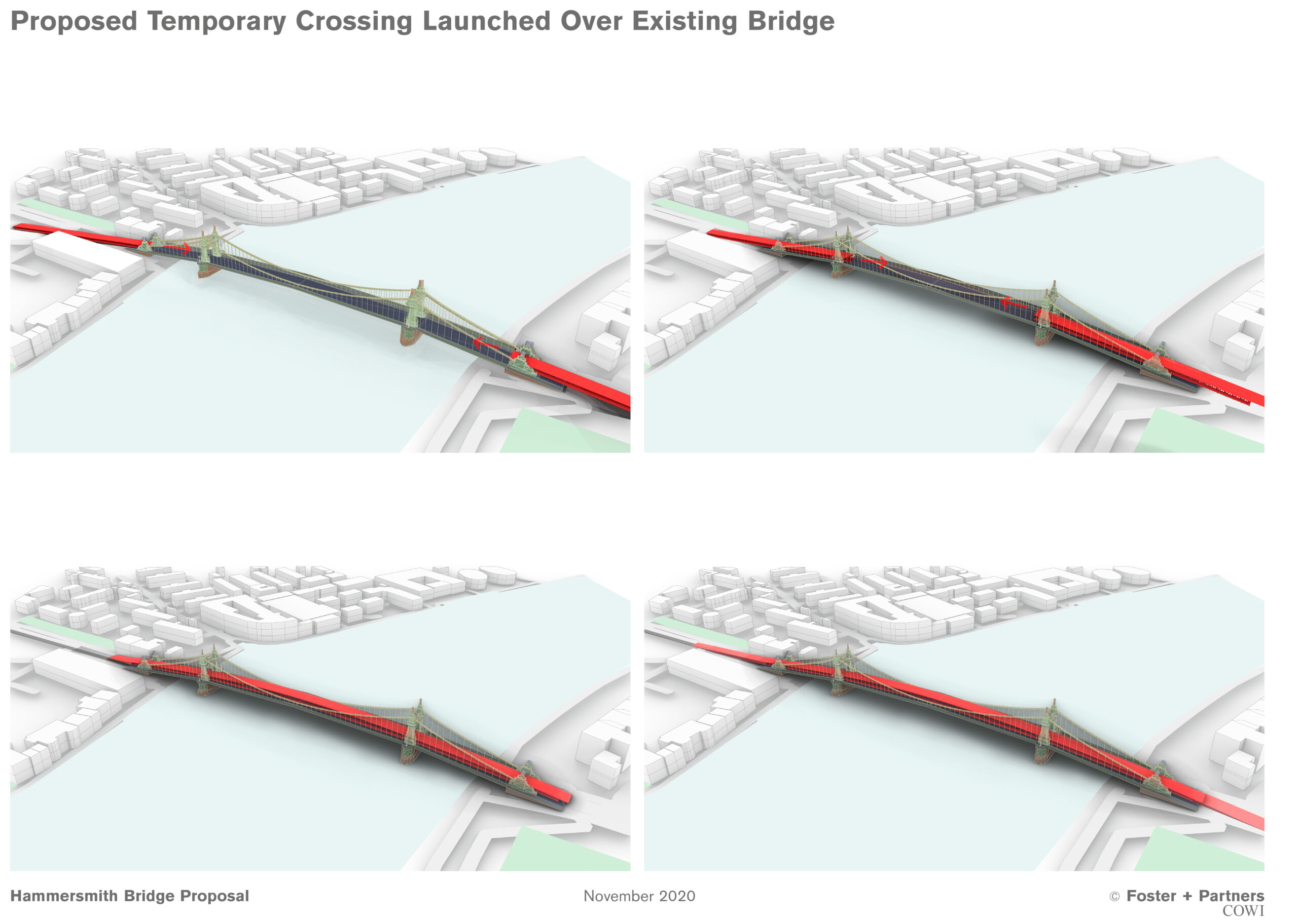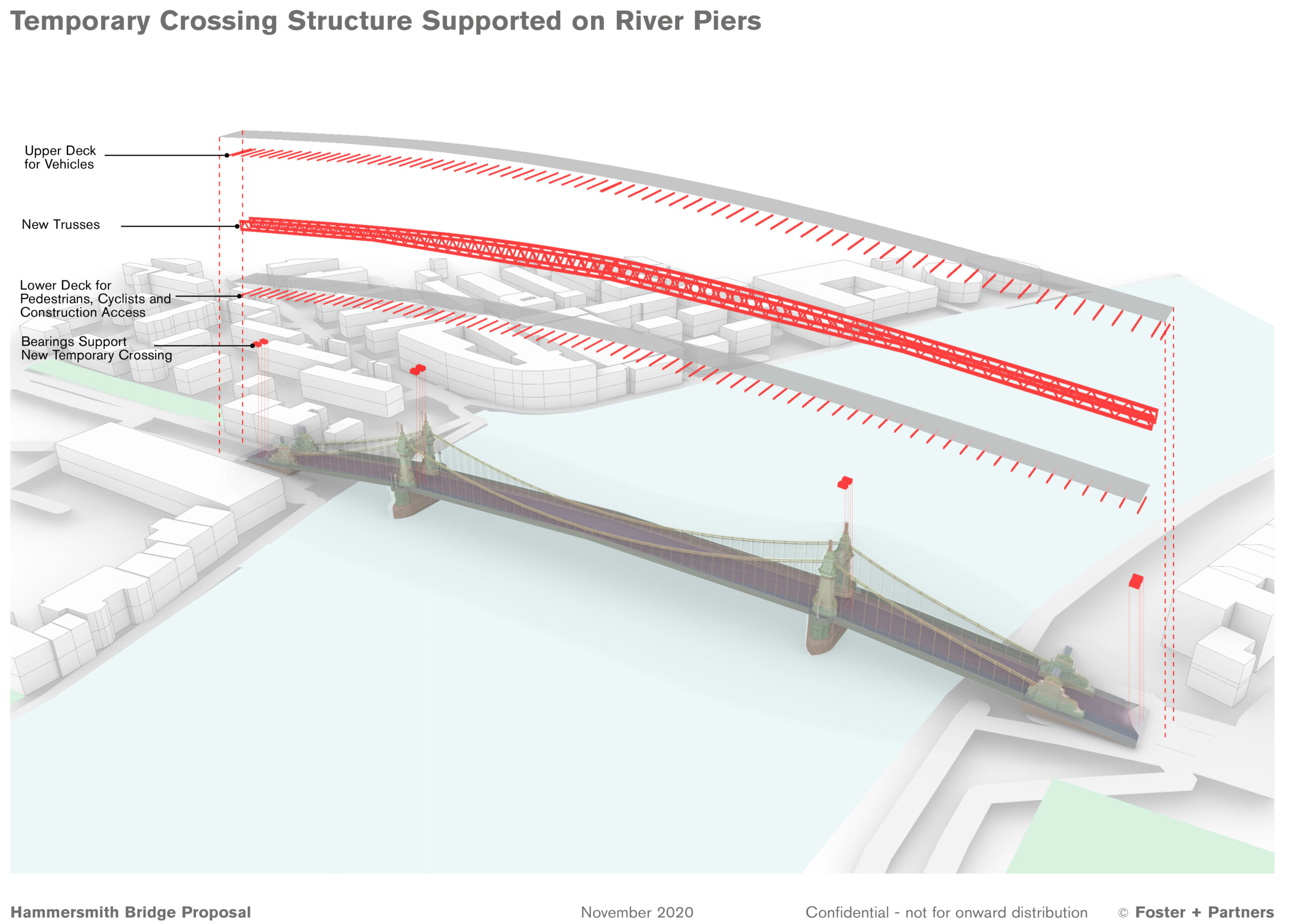 We were surprised and excited in equal measure to see a radical new proposal published by the council, in partnership with Foster and Partners and Sir John Ritblat of Delancey, the company now owning the Earls Court development site. This is designed to temporarily solve the conundrum of getting across the river while the original bridge is repaired. Details can be read on the council’s website, there’s obviously more detailed work needed to bring it to fruition.
