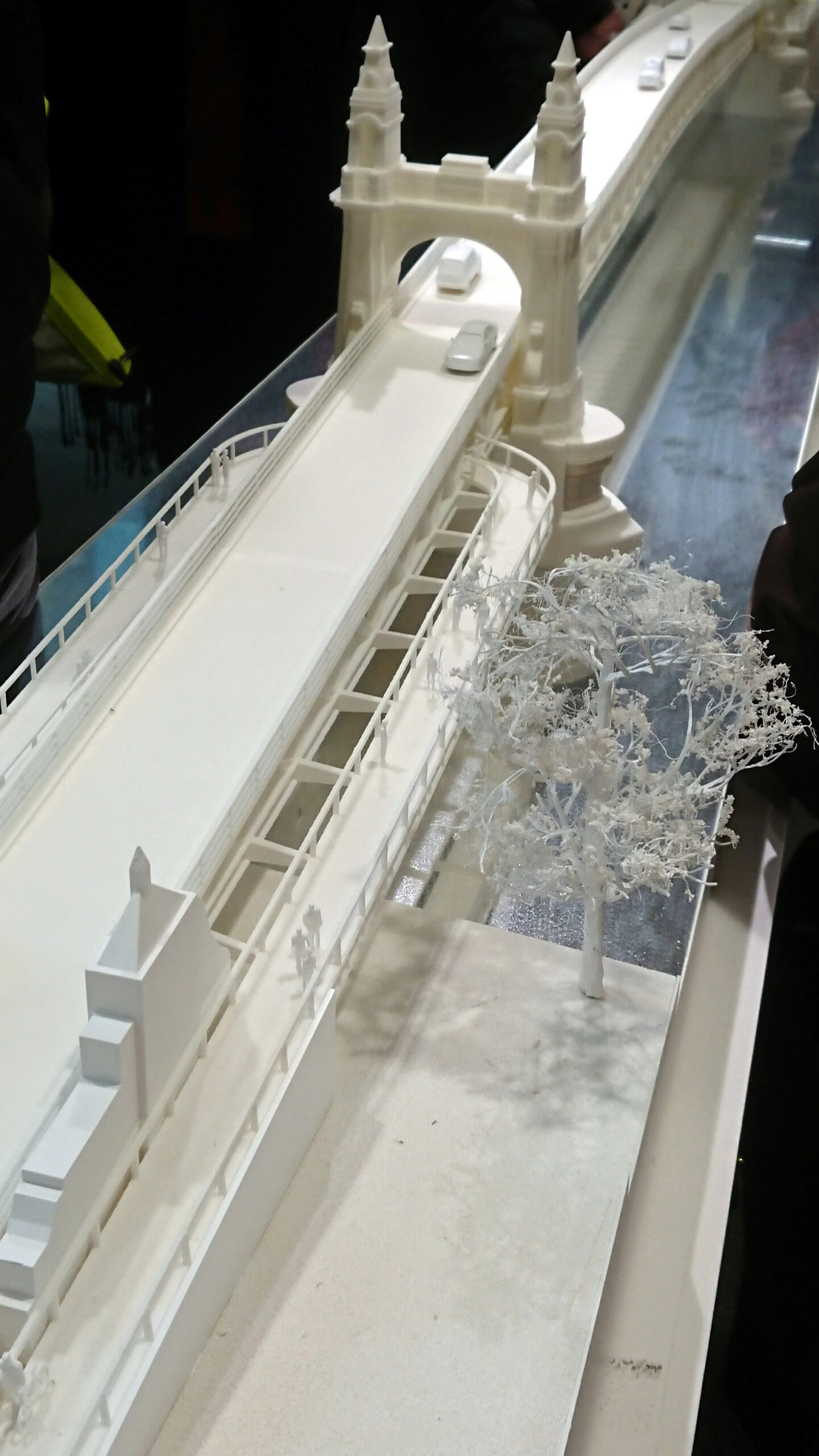 In the last week there have been well-publicised consultation meetings either side of the river, covering the repair and refurbishment of the bridge together with proposed Foster/COWI temporary bridge. Below are photos of the models of the proposals, but there’s one further public exhibition in Barnes this Saturday – details in the diary