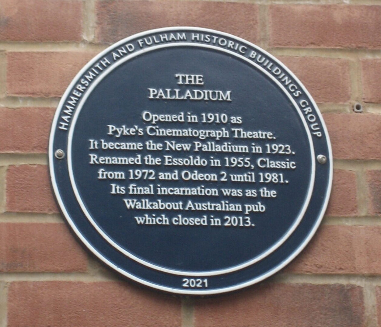 Next to the hotel is another piece of Shepherds Bush history, a building recently known as the Walkabout, which started life in 1923 as a 760 seat cinema – Pyke’s Cinematograph Theatre; this was enlarged and upgraded, introducing the front arch and pediment which is retained today, to become the New Palladium Cinema.